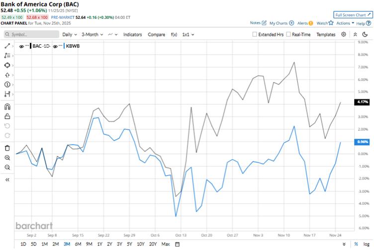 BAC’s stock reached a 52-week high of $54.69 on Nov. 12 due to strong investor sentiment, and is only down 4% from that high. Over the past three months, the stock has gained 6.1%. On the other hand, Invesco KBW Bank ETF (KBWB) has gained only 2.8% over the same period. Therefore, BAC is the clear outperformer compared to its banking peers.