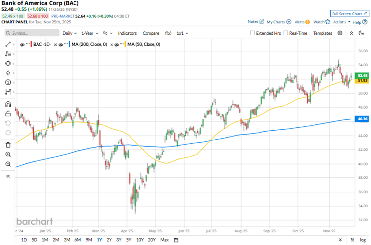 Over the longer term, a marginal outperformance persists. Over the past 52 weeks, BAC’s stock increased by 10.5%, while it is up 21.5% over the past six months. On the other hand, the Invesco KBW Bank ETF gained 9.7% and 21% over the same periods, respectively. The stock has been trading above its 200-day moving average since late May, and is currently hovering near its 50-day moving average.