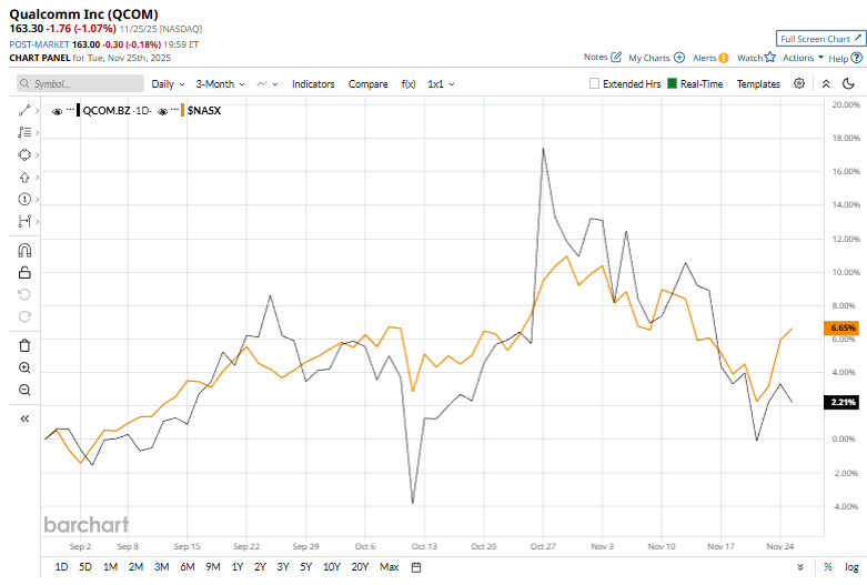 Shares of QCOM declined 20.7% from its 52-week high of $205.95 touched on Oct. 27. QCOM stock has surged 4.4% over the past three months, underperforming the Nasdaq Composite’s ($NASX7.4% rise over the same time frame.