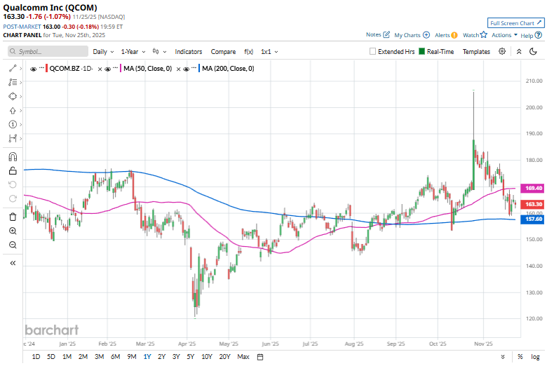 With a market cap of $173.4 billion, QUALCOMM Incorporated (QCOM) is a leading semiconductor and wireless technology company known for developing mobile connectivity innovations and powering much of the global smartphone ecosystem. Best known for its Snapdragon chipsets and advanced 5G modems, Qualcomm supplies high-performance SoCs widely used in Android devices and also holds a valuable patent portfolio that generates major revenue through technology licensing. The San Diego, California-based company’s business operates primarily through chip sales (QCT) and licensing royalties (QTL), giving it both volume and high-margin revenue.